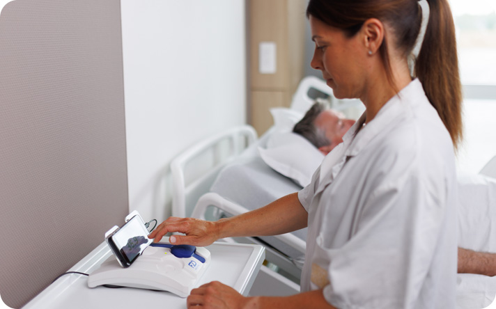 Le kit peut être réattribué très facilement lorsque la surveillance du patient est terminée. Après nettoyage des brassards, de la station et du terminal, il suffit de démarrer une nouvelle acquisition avec un nouvel identifiant patient (identifiant national de santé (INS) ou identifiant personnel défini par l’établissement), l’âge, le sexe, le poids et la taille du nouveau patient.